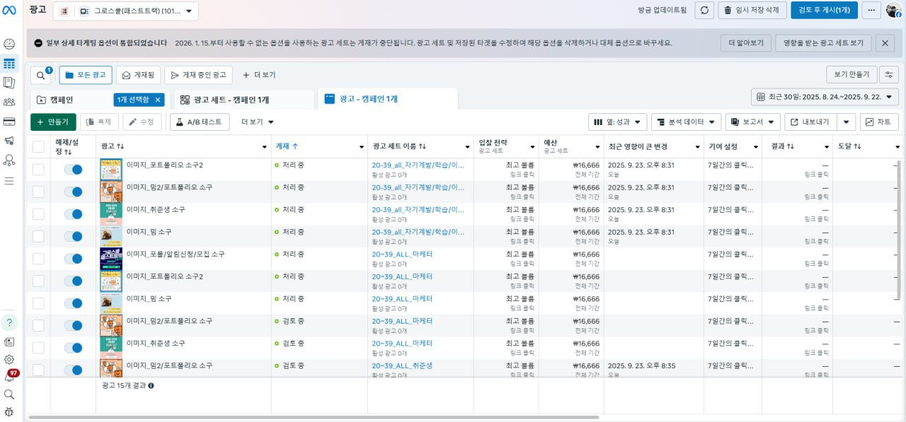 아무튼 그로스쿨의 실제 메타 광고 관리자의 권한을 초대 받아서, '직접' 내가 기획서에 작성한데로 메타 광고를 세팅을 하게 됩니다. 이 부분이 가장 어렵고, 오래 걸리고, 오류도 많이 나고, 힘들고, 재밌던 부분이고, 돈을 15만원이나 내고 해볼 수 있는 아주 중요한 부분이죠. 총 예산은 5만원, 기간은 5일로 설정해서 패스트트랙의 다음 기수 홍보를 위한 광고 소재를 제작하여 광고를 진행을 합니다. 메타는 광고 세팅만 잘해두면 AI가 머신러닝으로 알아서 잘 보여주기 때문에 세팅만 하면 끝입니다. 실제로는 꾸준하게 계속 광고 성과를 지켜보면서 최소 3주 이상 최적화를 시켜야한다고는 하는데, 5일밖에 못해서 아쉽긴 합니다. 그래도 이거로 15만원 낸거 중에 5만원은 건지지 않았나 싶네요 ㅎㅎ(슈퍼얼리버드로 싸게 구매하면 진짜 이득일듯!)