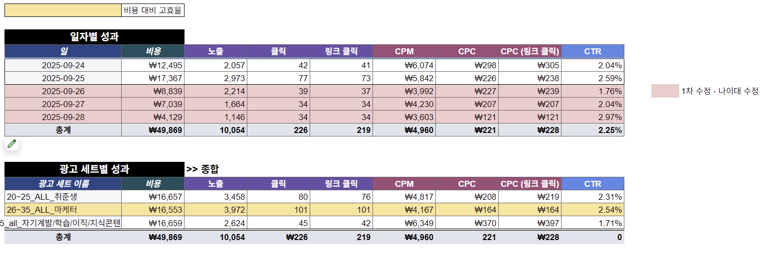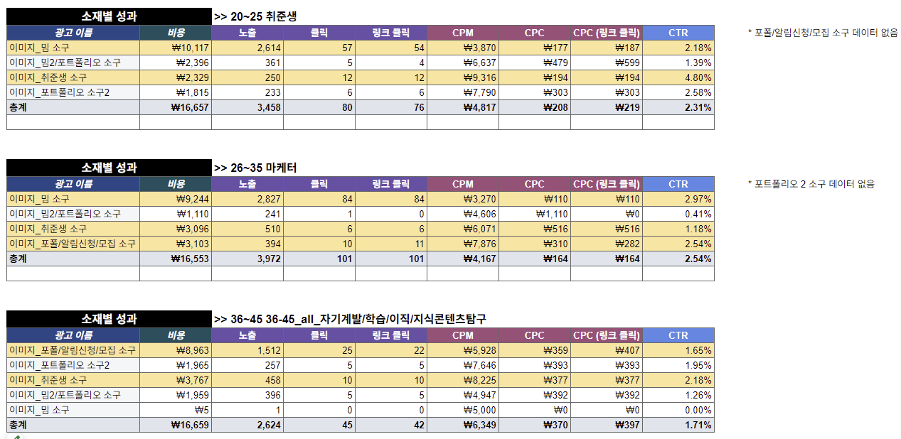 | 26~35 마케터 | 밈 | 9,244원 | 84 | 110원 | 가장 낮은 CPC 달성 |
