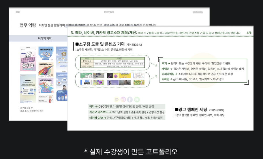 패스트트랙을 진행한다고 위와 같이 포트폴리오를 만들 수 있을까요?? 정답은 X입니다!! 자세히 보시면 카카오, 네이버도 보이죠 ㅎㅎ 해당 과정은 메타만 진행하기에, 카카오와 네이버 부분을 빼면 비슷하게 적을 수는 있을겁니다. 네이버와 카카오 부분을 제외하고 잘 다듬(?)는다면 충분히 비슷하게는 만들 수 있어보입니다. 그렇지만 '이 과정을 완료하면 나의 포트폴리오를 만들고 완성할 수 있겠어!' 라는 환상은 안갖는게 좋을 것 같습니다 ㅎㅎ 확실히 다른 여러 과정들에 비해서 압축적으로 기간도 짧고, 돈도 적게 들고 하다보니 많은 것을 기대할 수는 없는거 같네요. 그래도 '2주만에 메타 광고 관리자로 캠페인과 광고 세트를 세팅하고, 집행까지 해봤고 결과를 내볼 수 있다.' 라는 확실한 강점은 있습니다! 광고 결과까지 잘나왔다면 금상천화였을텐데 말이죠...ㅎㅎㅎ