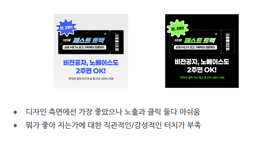 마지막 과제에 광고 이미지 2장을 제출하는 것이였는데, 2장 모두 메타 광고를 4만원씩 돌려주셨다. 인당 4700원 받고, 총 23개 x 4만원 = 920,000원을 태우는... 남는 장사 맞습니까???? 저게 정말 맞는지는 모르겠지만, 내 돈 들지 않고 광고를 돌려볼 수 있다는게 정말 크다고 봄 ㄷㄷ 또한 추가적으로 간단하게 광고 소재에 대한 피드백을 구글 슬라이드로 만들어서 공유해주셨음.