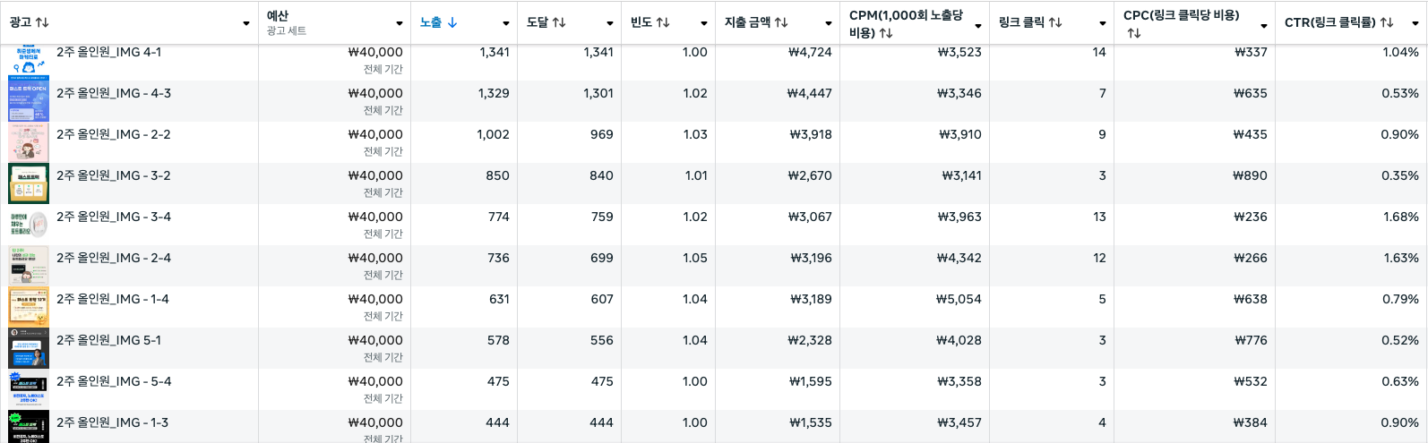 비록 1주일간의 짧은 광고 집행이였지만, 지출금액이 2만원 이상 / 노출수 6,000회 이상 / 링크 클릭 50회 이상을 기록한 이미지도 있었기 때문에 디자인적으로는 노력했으나 아쉽지만 광고로써는 실패했다고 봐야함. 이게 실제 우리 회사 혹은 나의 사업 아이템의 광고 집행 결과라고 생각한다면 당장 수정을 했어야하는 수준.